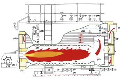 WNS系列全自動燃油(氣)蒸汽鍋爐(實用新型專利),采用臥式三回程濕背結構,改善鍋爐運行環境,提高鍋爐效率和使用壽命;全部煙氣通道置于水中,尾部配有余熱水箱及完善的保溫外包設計,煙箱密封采用迷宮式結構,避免了煙箱漏煙現象。工作原理如下圖所示: