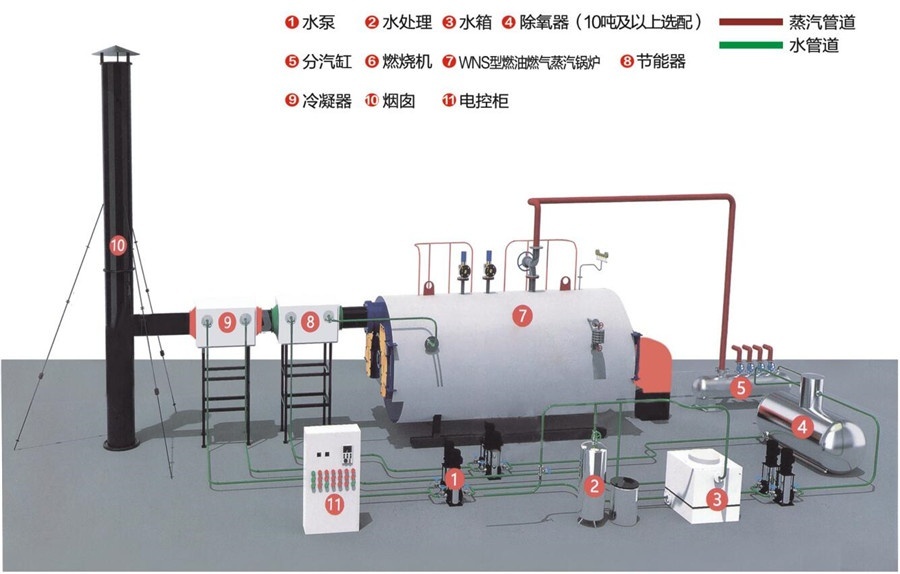 WNS系列全自動燃油(氣)蒸汽鍋爐(實用新型**),采用臥式三回程濕背結構,從而改善了鍋爐運行環境,提高了鍋爐燃燒效率和使用壽命。